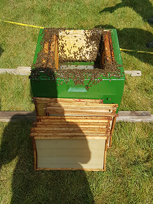 Der Imker kletterte ohne Schutzkleidung die Leiter hoch und stieß mit dem großen Eimer von unten an den Ast, an dem die Bienen hingen. Durch das Stoßen fielen die meisten der Bienen in den Eimer. Der Imker kletterte mit dem Eimer wieder nach unten und schüttete alle Bienen in eine grüne Box (später lernte ich dann, dass die Bienenbehausung BEUTE heißt). Dann kamen einige Waben mit Mittelwänden hinein und zum Schluss der Deckel drauf.
