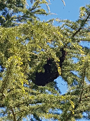 Nach ungefähr 30 Minuten sammelten sich die Insekten und bildeten eine große Traube an unserer Himalayzeder in 4m Höhe. Ich habe Google gefragt, was das denn sein kann...und Google meinte: ein Bienenschwarm - und gab auch gleich den Tipp, einen Imker im Ort anzurufen.